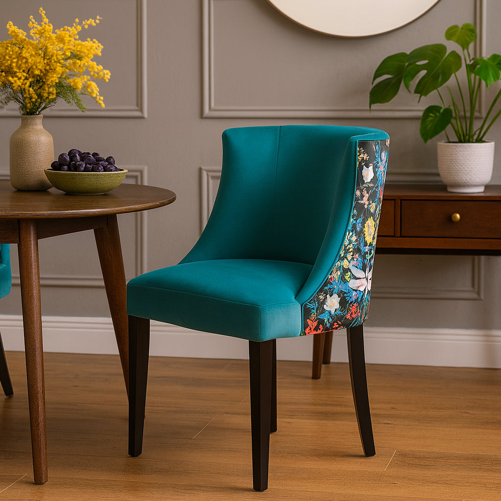 This elegant dining chair exudes luxury with its vibrant teal upholstery, which adds a pop of colour to any dining space. The chair features a sleek, contoured design, with a subtly curved backrest for added comfort. Its striking floral-patterned fabric on the back adds a unique, artistic flair. Supported by slim black legs, this chair perfectly combines modern style with sophistication, making it ideal for upscale dining rooms or formal settings.